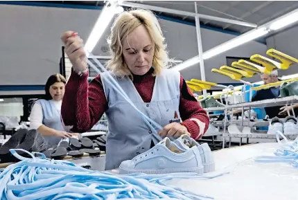 Os operários da Aboutoday parecem estar num exercício de natação sincronizada. No início da linha estão as costureiras, sentadas à máquina, a coser a lona dos ténis — ou sapatilhas, como se diz no Norte. Depois, em caixas, separadas por modelos, os corpos do sapato estão prontos a serem colocados em formas que lhe darão a ergonomia necessária para serem calçados. Colocam-se as solas em termoplástico vegano reciclado e passam para a finalização.